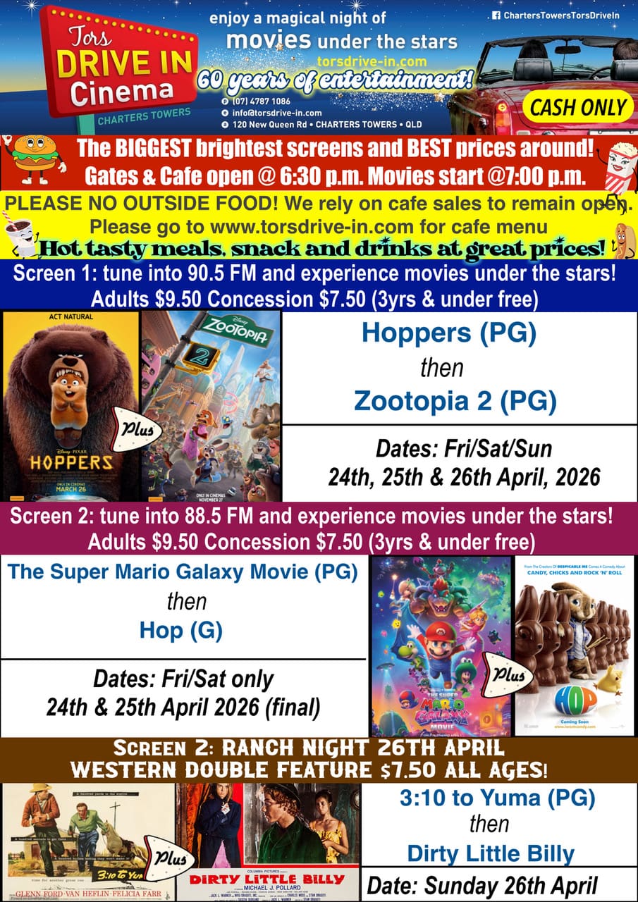 TORS Drive In Cinema in Charters Towers is home to the BIGGEST, BRIGHTEST screens and the BEST prices around!